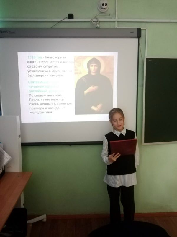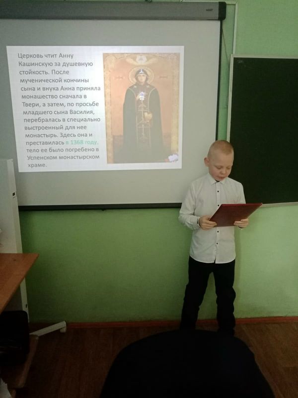26 сентября в 5-а классе в рамках курса " Моя семья"прошёл классный час по теме "Святая Анна Кашинская". Ребята познакомились с жизнью великой княгини,узнали, почему её почитают в России и Тверском крае. Удивило ребят то, что, приняв тяжкие удары судьбы, Анна не впала в отчаяние, не озлобилась на людей, а твёрдо решила посвятить оставшуюся жизнь защите несчастных.