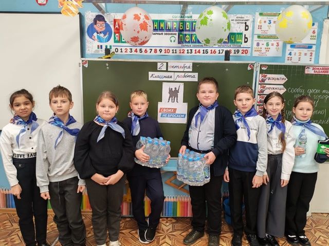 В начальной школе проходила акция "Своих не бросаем" . Учащиеся вместе с родителями приносили питьевую воду и теплые носки для наших военнослужащих в зоне СВО.Вместе с гуманитарной помощью к нашим солдатам поедут письма, написанные ребятами.Учитель физкультуры Тимашенкова Е.С. связала 6 теплых носков, она постоянно вяжет носки для наших военнослужащих и отправляет с гумконвоями. Огромная благодарность всем, кто откликнулся на призыв о помощи.