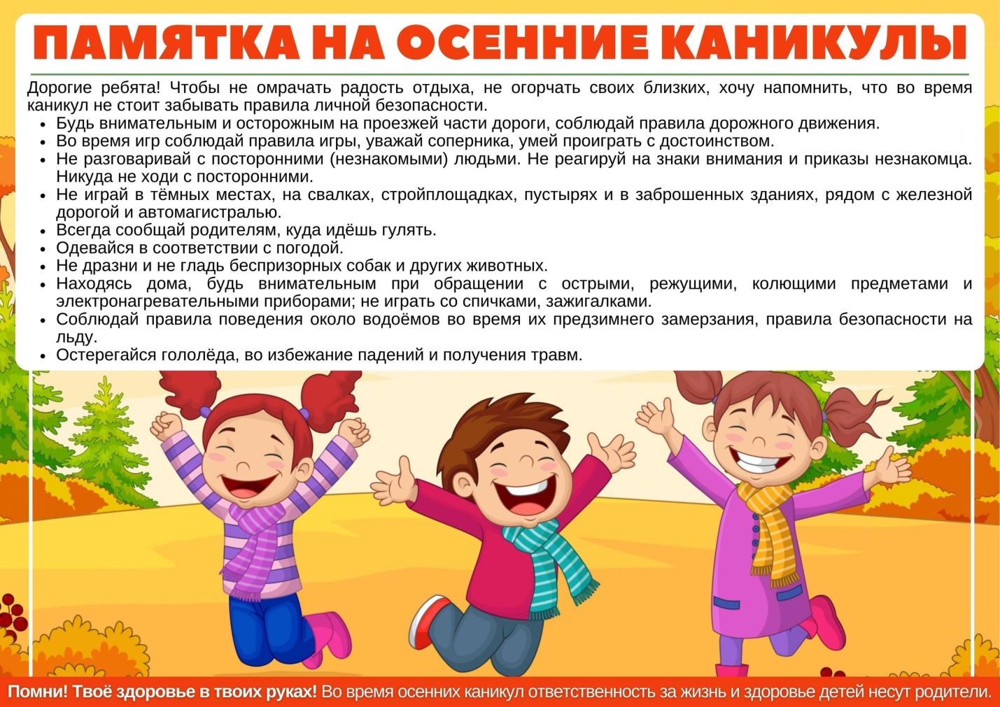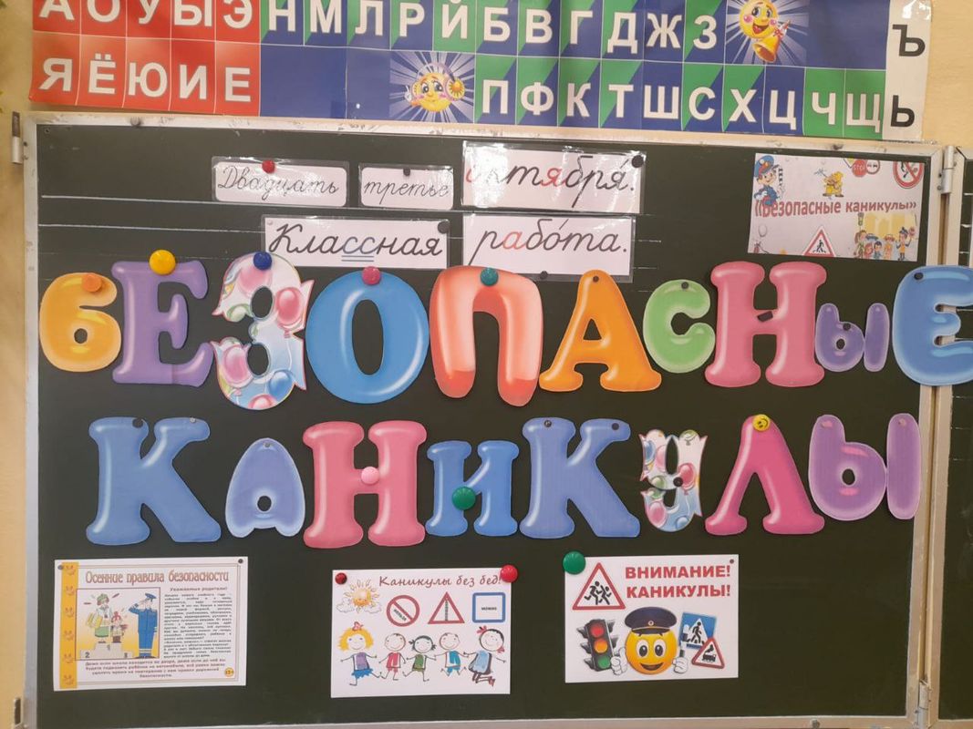 С 1-по 11 классы был проведен комплексный инструктаж по безопасности на осенние каникулы. Показаны презентации, фильмы, брейн-ринги, беседы. Были рассмотрены основные правила по дорожной безопасности, пожарной безопасности, безопасности на улице, дома, на водоемах, в лесу, в интернете, а также пользование электроприборами и розетками; общения с незнакомыми людьми, правила поведения на ж/д объектах, использование фотоотражающих элементов на одежде для личной безопасности, правила поведения при получении травм, как поступать если звонят мошенники или с неизвестного номера Правила поведения при террористическом акте, и налёте беспилотников, правилам использования электросамокатов, велосипедов, Особое внимание было уделено профилактике правонарушений несовершеннолетних, комендантскому часу для несовершеннолетних.