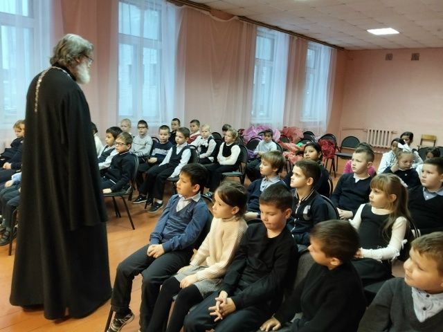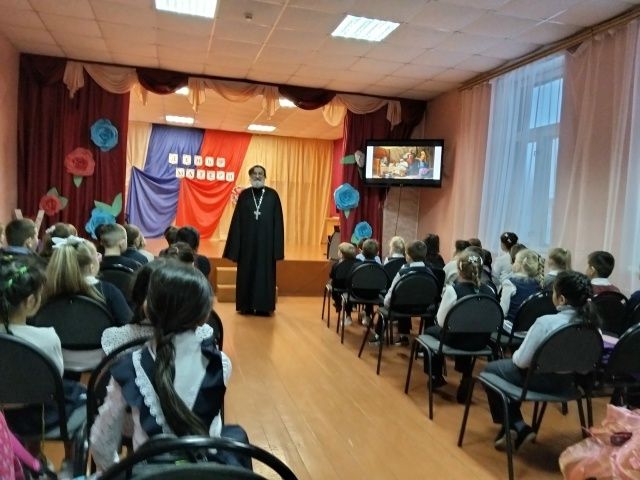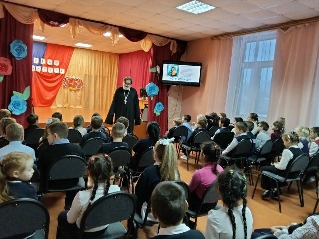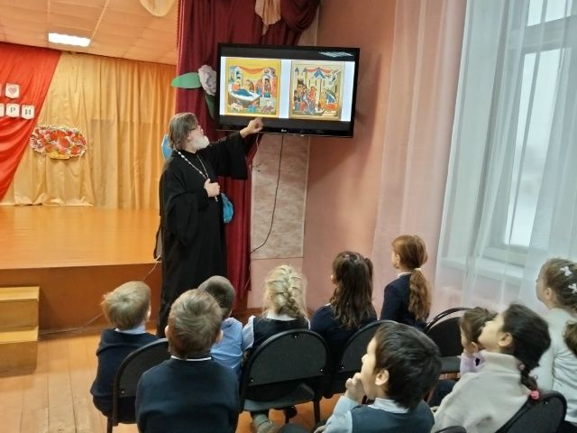 В рамках духовно- нравственного воспитания сегодня к первым классам приходил отец Сергий, протоиерей Балыкинской иконы Божией матери . Отец Сергий беседовал со школьниками о Божией Матери, истории её жизни, главных событиях, отразившихся в православных праздниках. О почитании Богородицы. Ознакомил с различными иконами Богородицы.