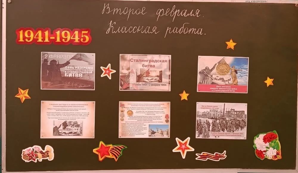 Учителя рассказали о мужестве и героизме русского народа, одержавшего великую победу в битве под Сталинградом, о борьбе за Мамаев курган и дом Павлова, о том, что Сталинграду (ныне Волгограду) присвоено звание города-героя.Учащиеся узнали о решающем сражении, повлиявшем на ход Второй мировой войны, советские войска одержали победу, а битва ознаменовала начало коренного перелома в ходе Великой Отечественной войны и Второй мировой войны в целом.